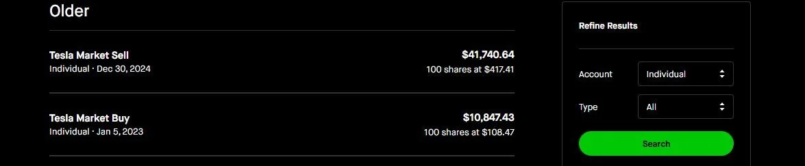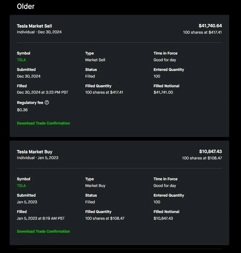 On January 5, 2023, I made a significant decision to invest in Tesla stock at a price of $108.47 per share. Fast forward to December 30, 2024, and I sold those shares for an impressive $417.41 each. This strategic choice led to a remarkable profit of $30,893.21 before taxes.
